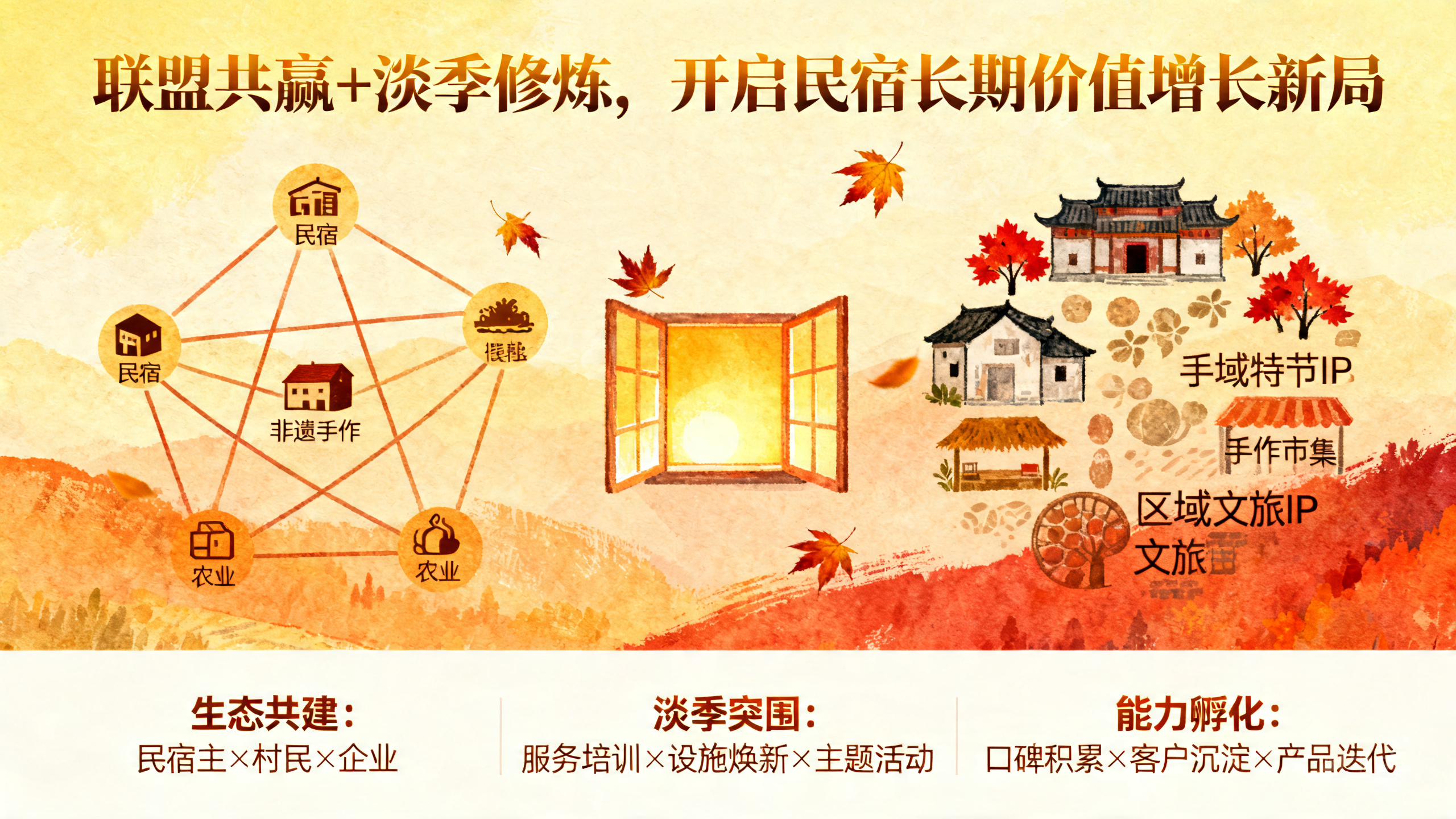 同一区域的民宿,可以从竞争者变为合作者。协商在淡季的不同时间段,轮流推出不同的主题活动,形成“月月有主题,周周有活动”的区域营销节奏。例如,本周是A民宿的“亲子周”,下周是B民宿的“瑜伽周”,再下周是C民宿的“摄影周”。通过统一的宣传出口对外推广,共同吸引游客前来,将“流量”留在本区域内循环。